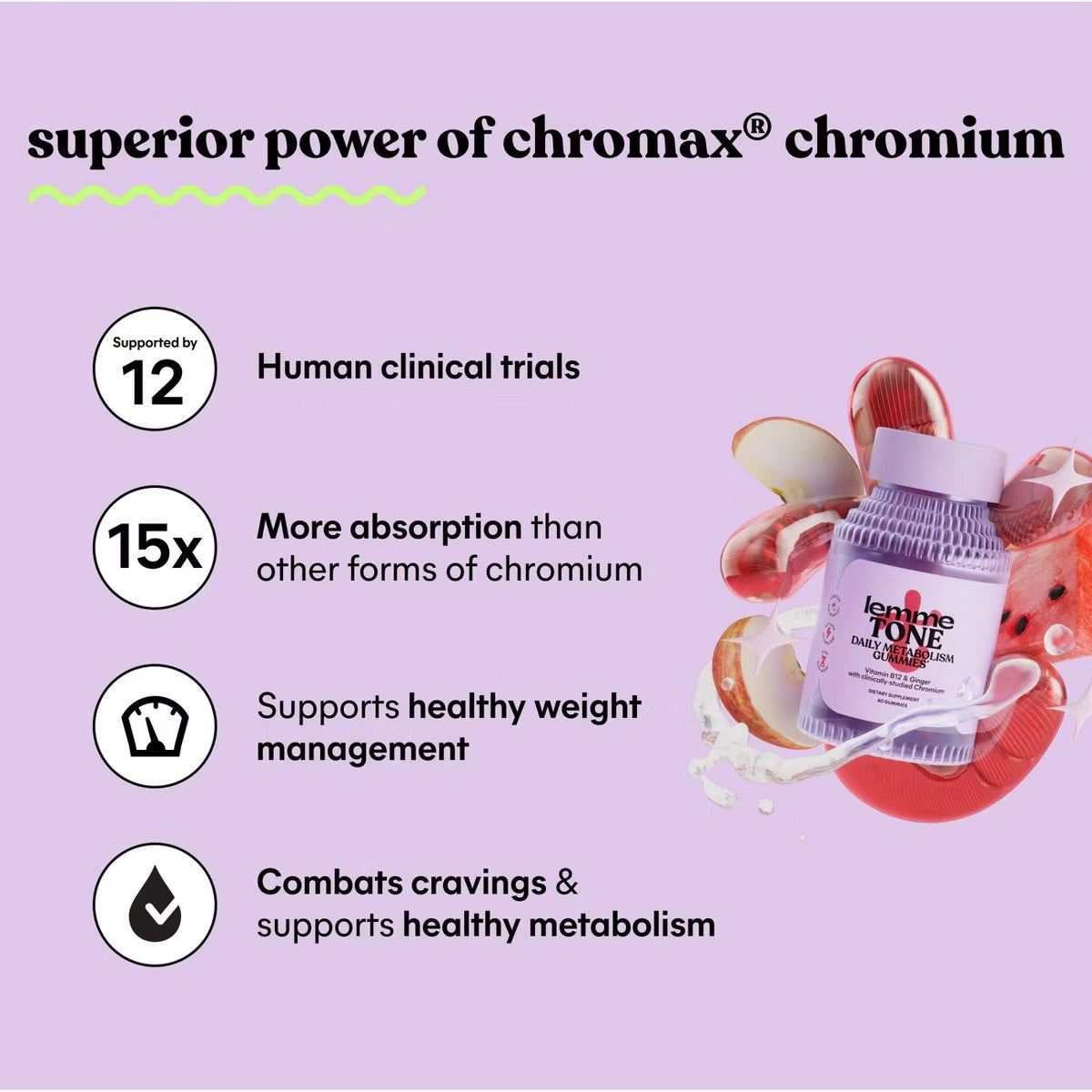 Lemme Tone gummies are formulated with clinically-studied Chromax® Chromium Picolinate, shown in human clinical studies to promote lean body mass, support healthy body composition, reduce cravings, boost metabolism and support healthy weight management. Each delicious gummy also has Apple Cider Vinegar, Organic Ginger and Methylated Vitamin B12 to support digestion and promote cellular metabolism.